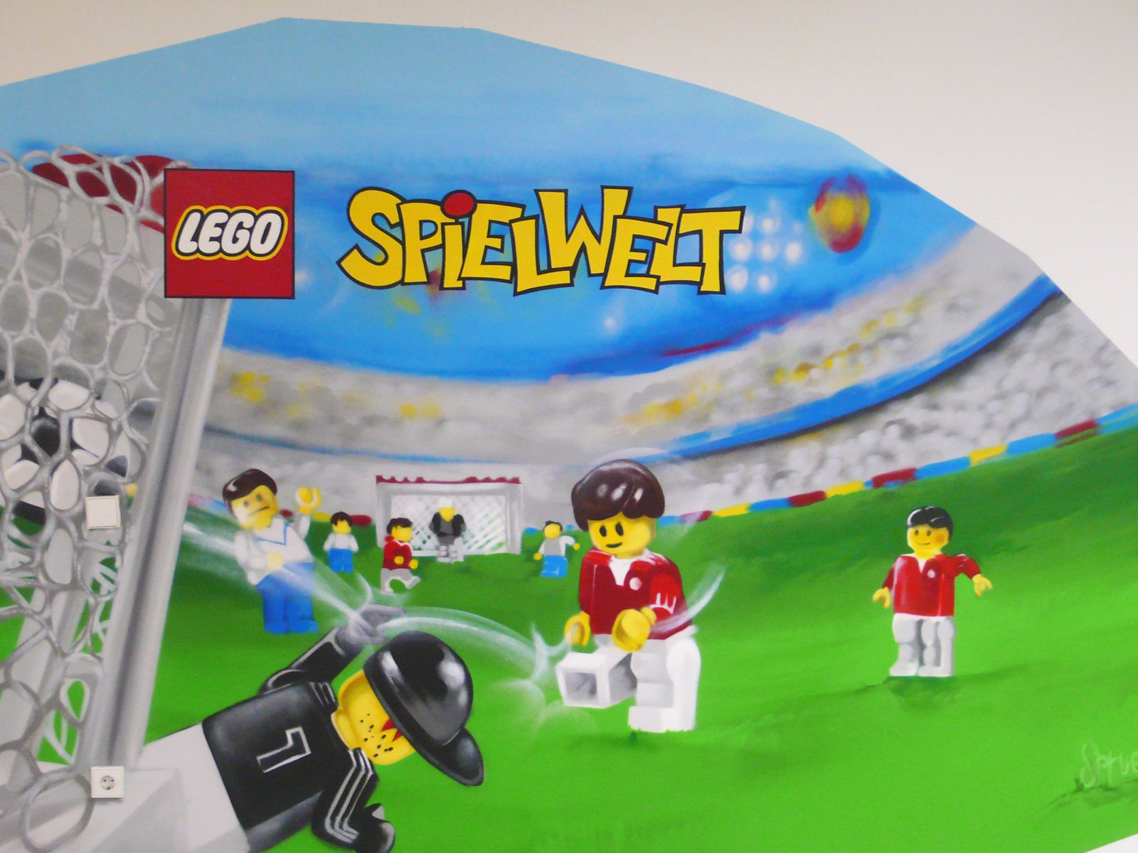 Lego und der FC Bayern München haben eine Kooperation. Und wir erhielten den Auftrag, die Räumlichkeiten mit einem coolen Graffiti zu verschönern. Neben Tierpark, Baggern, Polizeistation und Feuerwehreinsatz haben wir selbstverständlich auch eine Wandmalerei im Fußball-Style kreiert. 1:0 für uns.