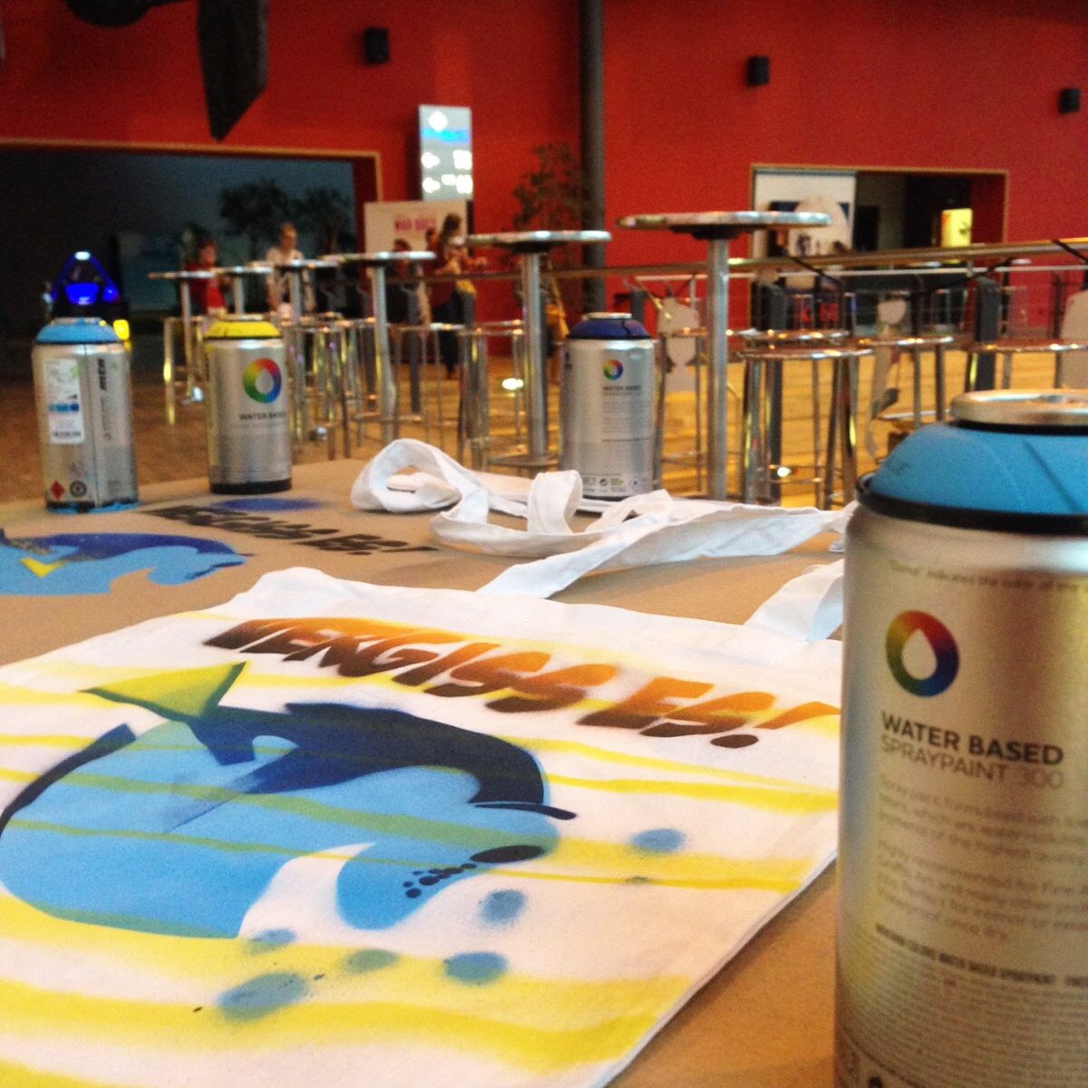 Schablonengraffiti auf Jutebeuteln bei Film-Premieren