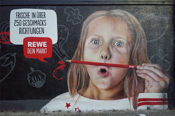 Die Aufgabe war es eine Fassade zum Thema „Frische in über 250 Geschmacksrichtungen“ für den REWE Markt Hürth zu gestalten. Somit wurde ein Auszug aus dem Frischesortiment in Kombination mit Bildelementen der Kölner Skyline und einer Mädchen-Darstellung gezeigt.